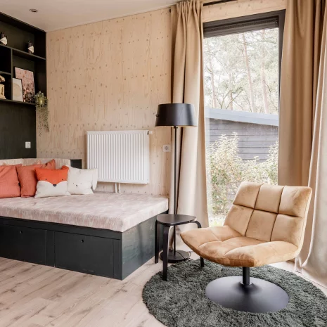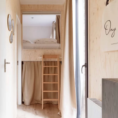 Met 40m2 is er beperkte ruimte in Onyx. Door een slimme indeling wordt elk stukje optimaal benut. Een bank en daybed in de wandkast met lades bepalen de warme luxe sfeer. Terwijl er voldoende ruimte blijft voor een gezellige eettafel en heerlijk fauteuil om in weg te zakken en een boek of tijdschrift te lezen.